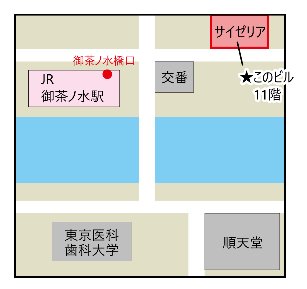 JR御茶ノ水駅御茶ノ水橋西口を出てすぐの交番を 水道橋方面へ徒歩約1分。 (ミニストップの右隣)